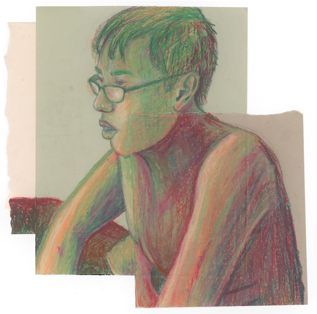 For the colors, I intentionally had most of the cool, green tones are on the center, cool-toned paper, while all of the warmer, red tones are on the right beige paper. The shadows of his stomach are more chaotic and striated. while his illuminated face is blended more smoothly