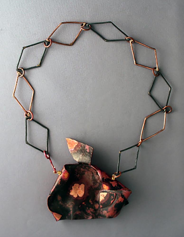 Anna Thomas, ’23. Copper sheet metal, copper wire, brass wire, liver of sulfur patina, heat patina.